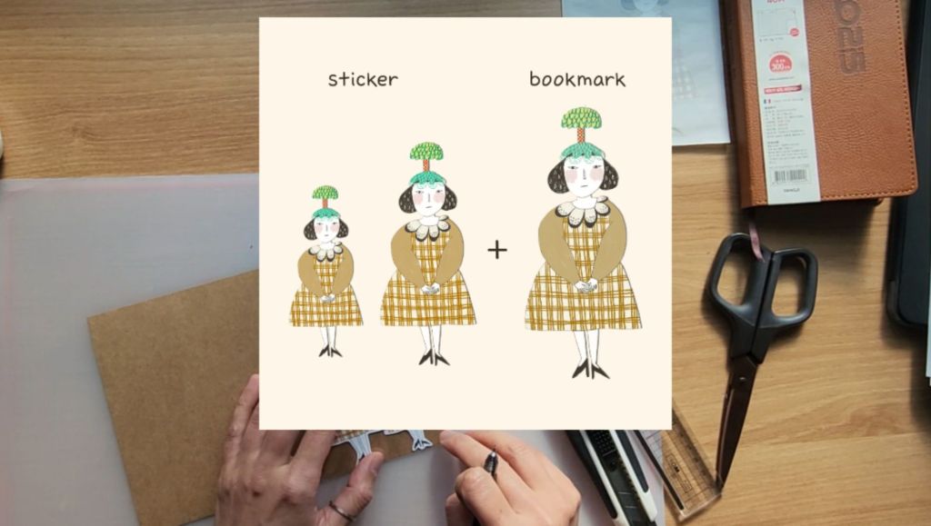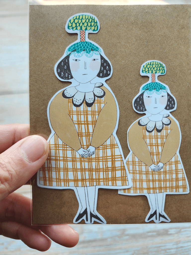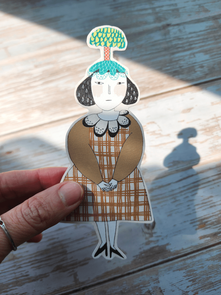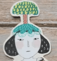 A collection of mini bookmarks and stickers featuring a girl wearing a tree hat.